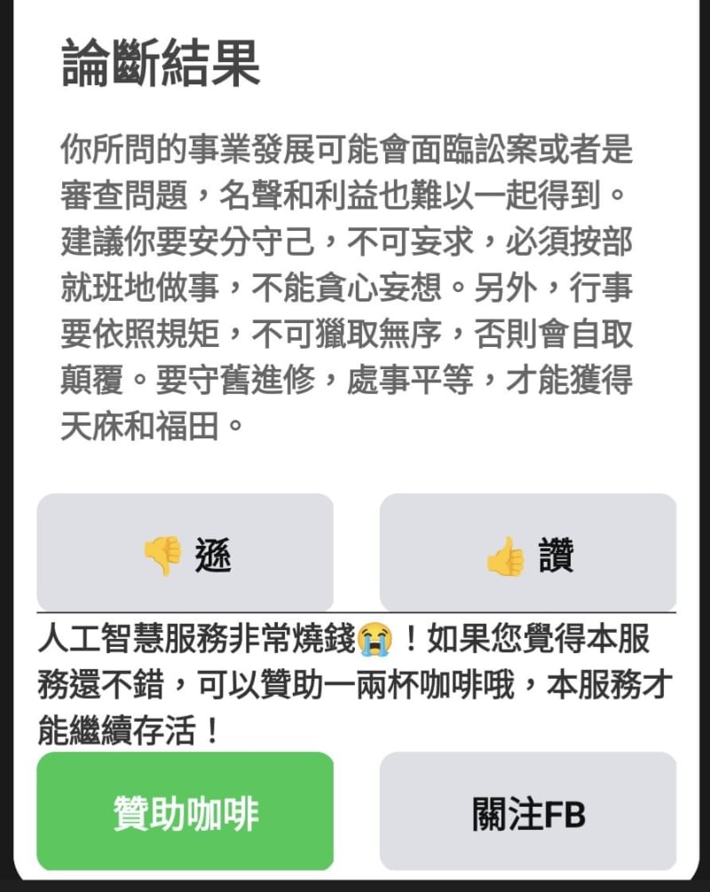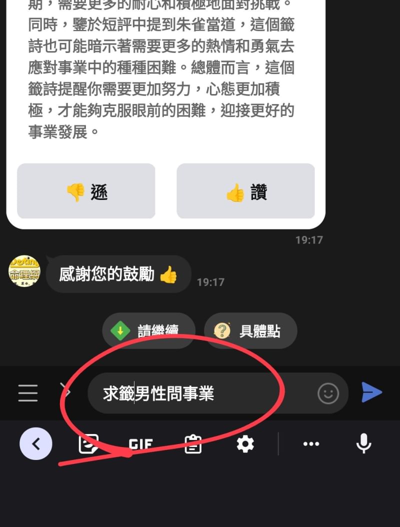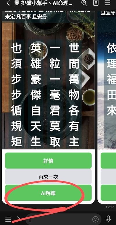 <figure><img src="https://1387164651-files.gitbook.io/~/files/v0/b/gitbook-x-prod.appspot.com/o/spaces%2FYkZZZGxFJ7v3aOMDSyC2%2Fuploads%2F0st9pclrtGRAKFl5jZeL%2Fm800x1200-1.jpg?alt=media&#x26;token=ee78f47b-76a2-4692-82dd-41c76e918315" alt=""><figcaption><p>記得點擊 AI解籤按鈕</p></figcaption></figure>